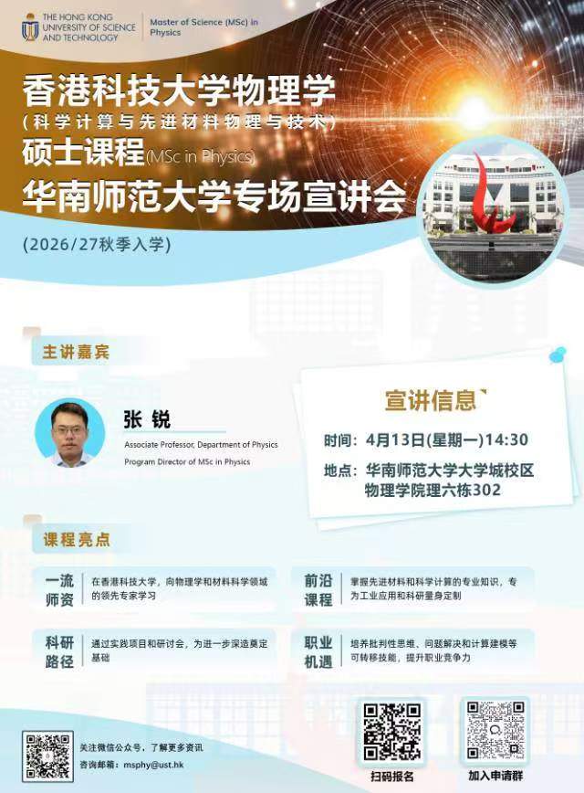 香港科技大学物理学(科学计算与先进材料物理与技术)理学硕士26FALL入学!华南师范大学专场招生宣讲会暨学术分享会